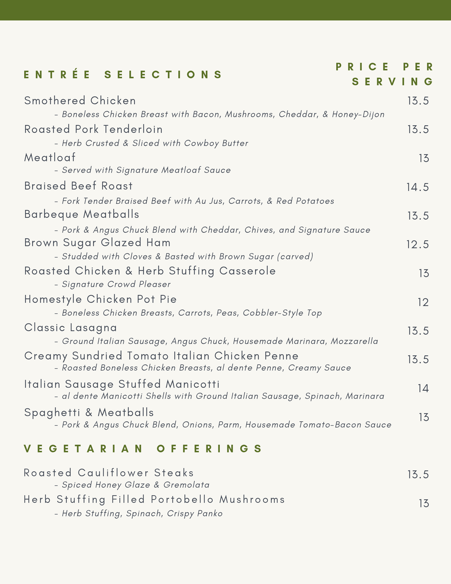 We combine a thoughtful, human-centered approach with clear communication and recommendations best suited for you and your event. We will ask questions regarding your guests to ensure serving sizes are dialed in. Our portions are generous and suited for buffets with seconds available. If you know your crowd will eat lighter, we can assist in adjusting serving sizes for your tailored catering quote.