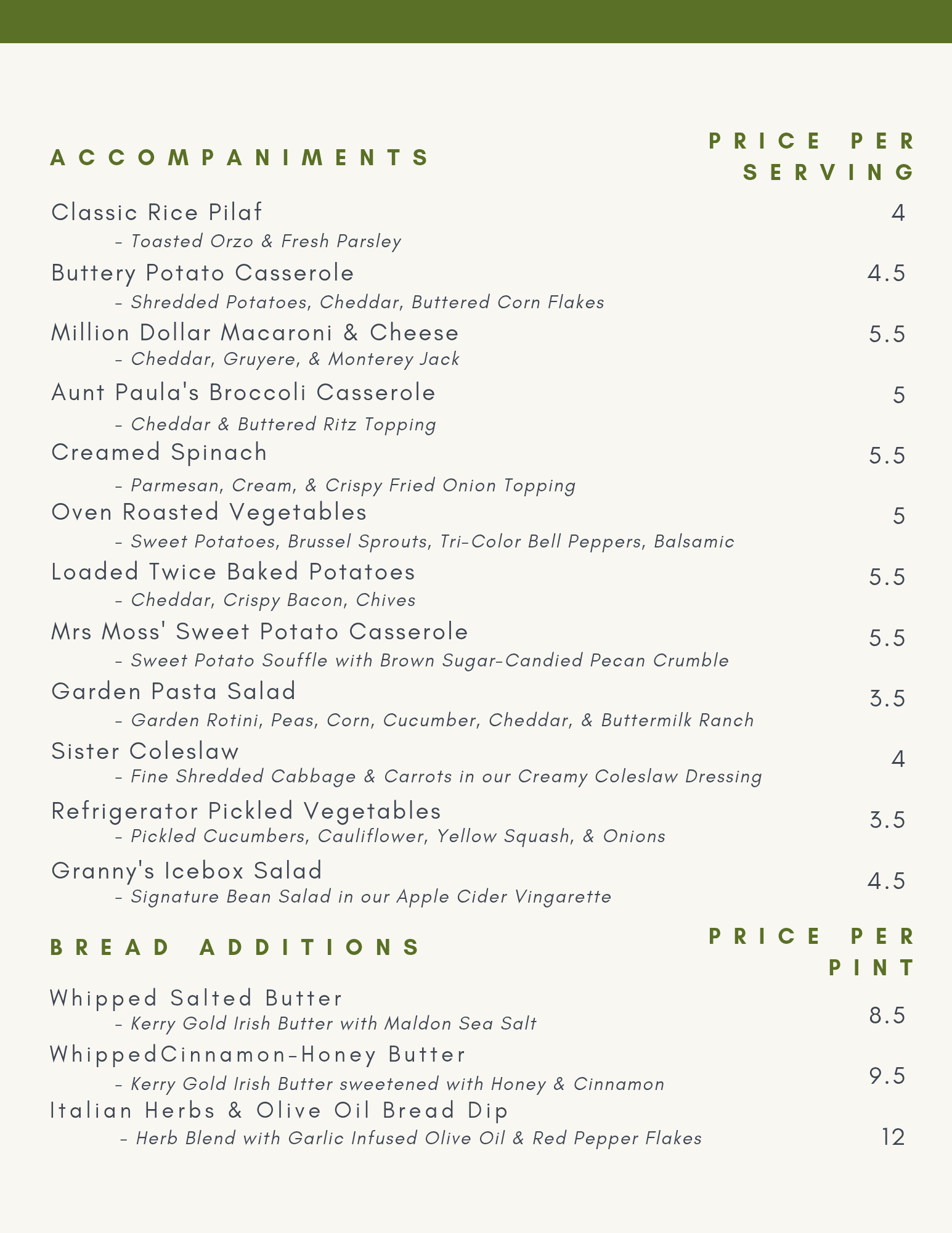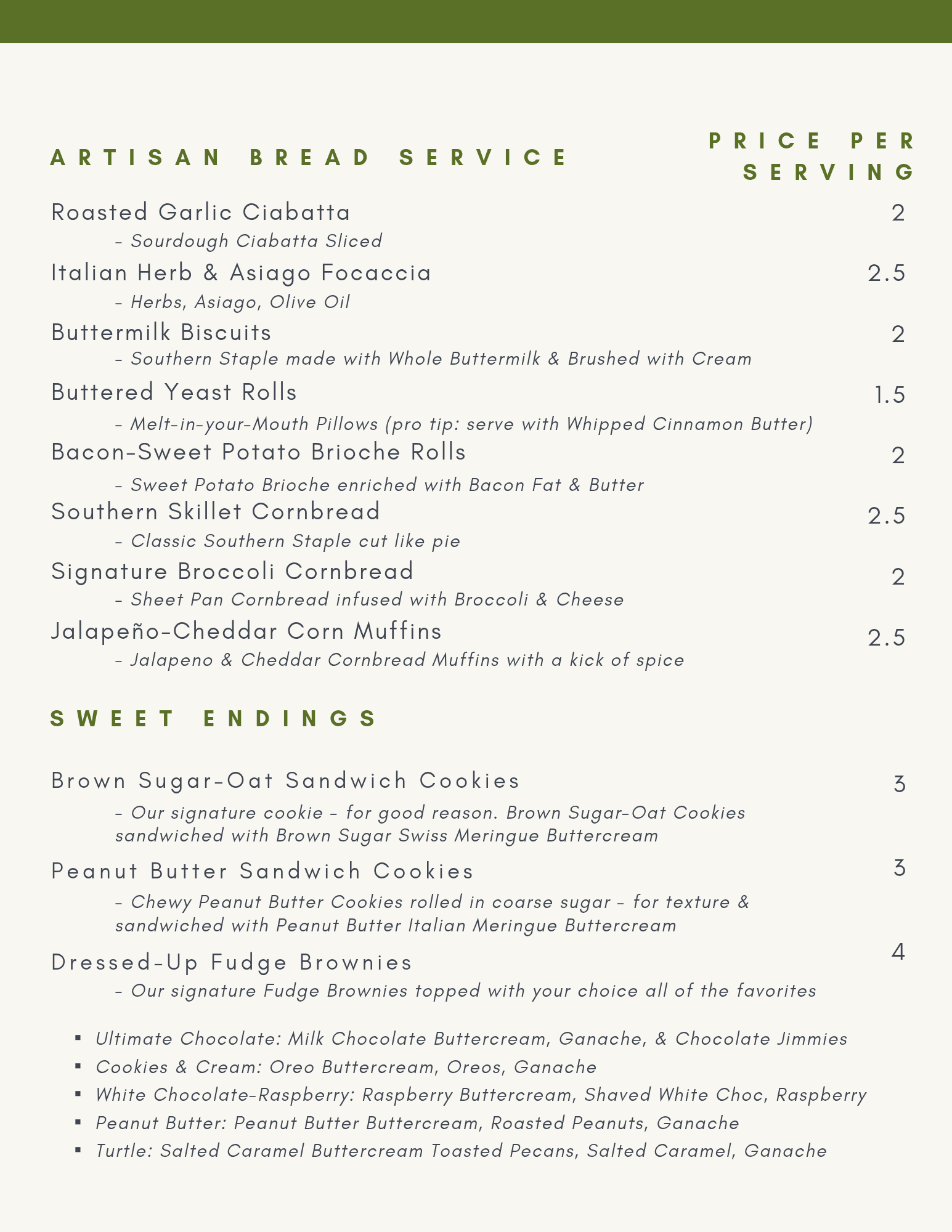 Our menu is a la carte priced per serving. Our servings are generous and can be adjusted based around your guests. This approach allows us to get as close to the moving target of too much and not enough food for your event. You know your guests best: we will ask the questions upon receiving your request using our “Let’s Work Together” form below.